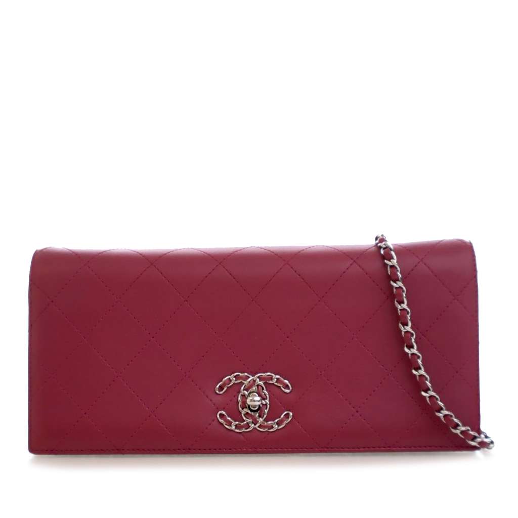 This crossbody features a quilted lambskin leather body, a leather woven chain shoulder strap, a flap with twist-lock closure, and interior flap and slip pockets.