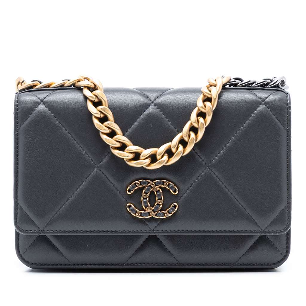 This wallet on chain features a quilted lambskin leather body, a chain-link handle, a leather woven chain link shoulder strap with leather guard, a flap with magnetic closure, and interior zip and slip pockets.