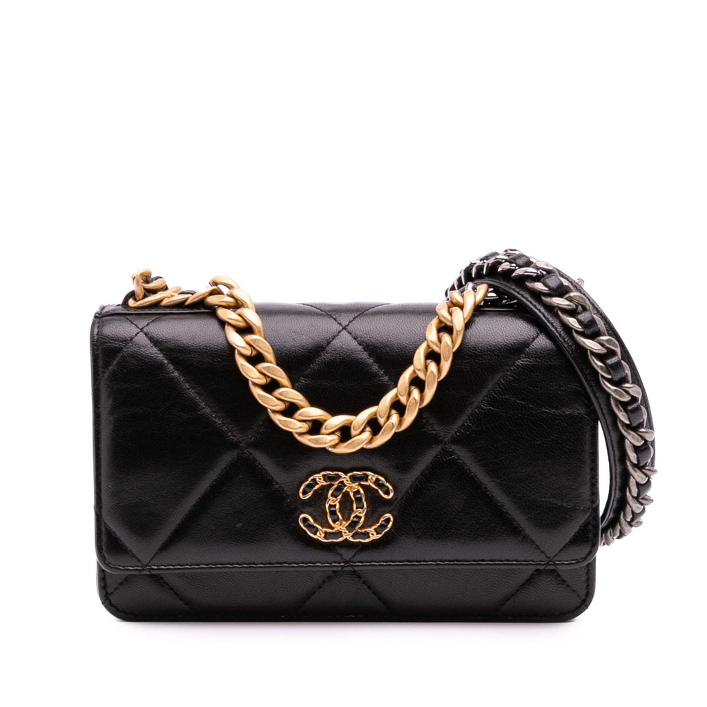 This wallet on chain features a quilted lambskin leather body, a chain-link handle, a leather woven chain shoulder strap with leather guard, a flap with magnetic closure, and interior zip and slip pockets.
