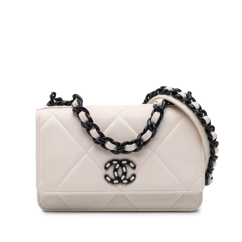 This wallet on chain features a quilted lambskin leather body, a chain-link handle, a leather woven chain link shoulder strap with leather guard, a flap with magnetic closure, and interior zip and slip pockets.