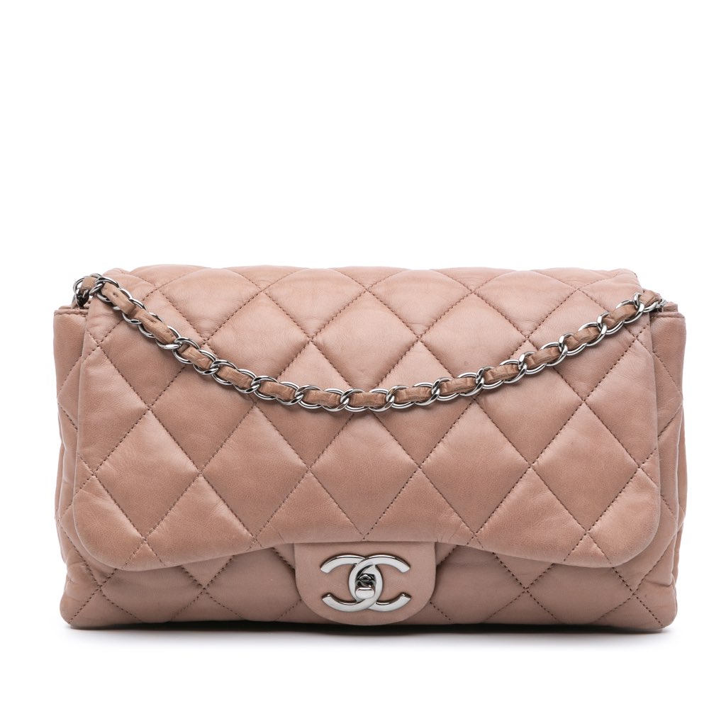 This flap bag features a quilted lambskin leather body, leather woven chain straps, a front flap with turn lock closure, three interior compartments, an exterior back slip pocket, and an interior zip pocket.