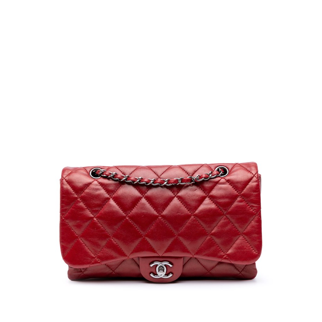This flap bag features a lambskin leather body, a leather woven chain shoulder strap, a front flap with turn lock closure, an exterior back slip pocket, three interior compartments, and an interior zip pocket.