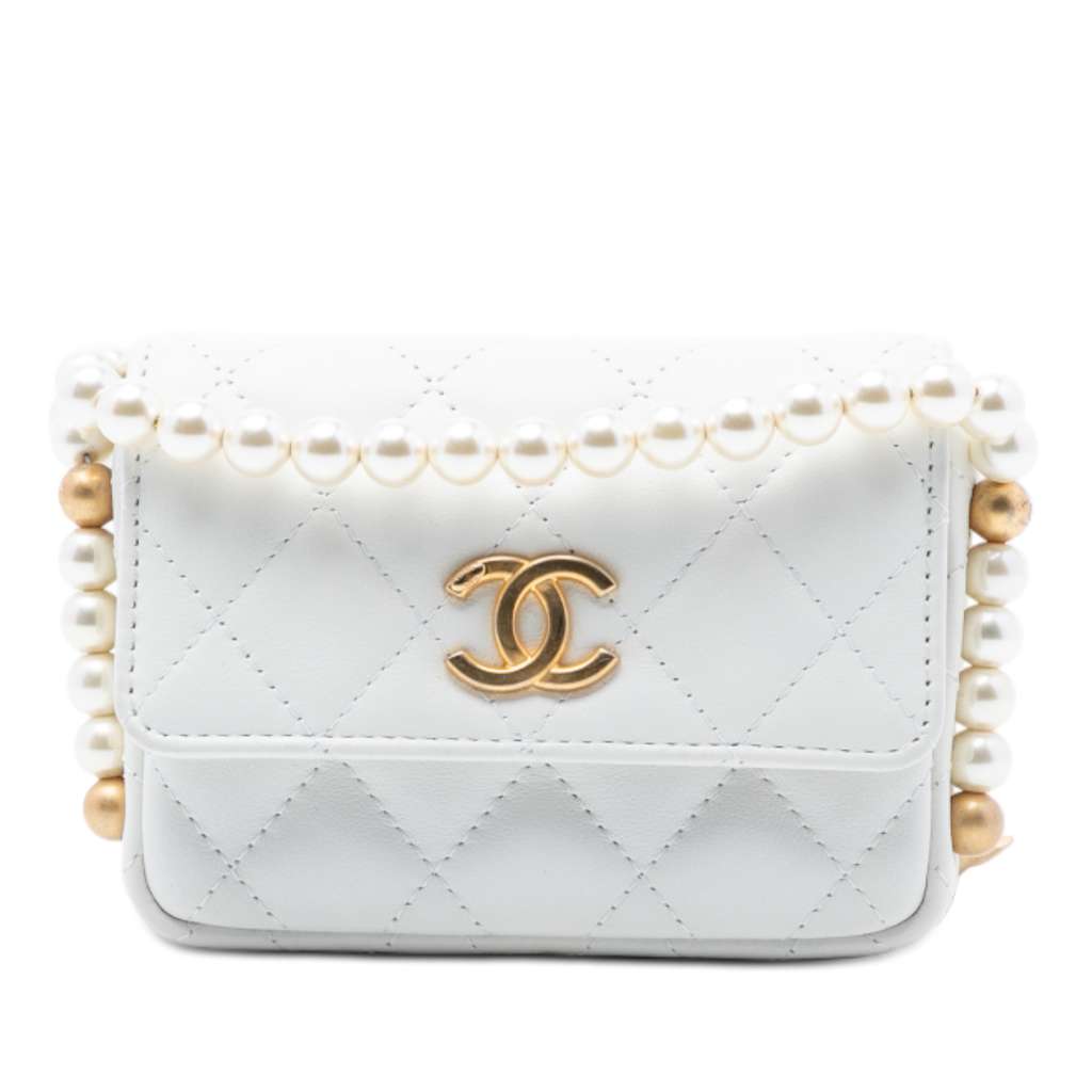 This crossbody bag features a quilted lambskin leather body, faux pearls with leather guard strap, and a front flap with magnetic snap closure.