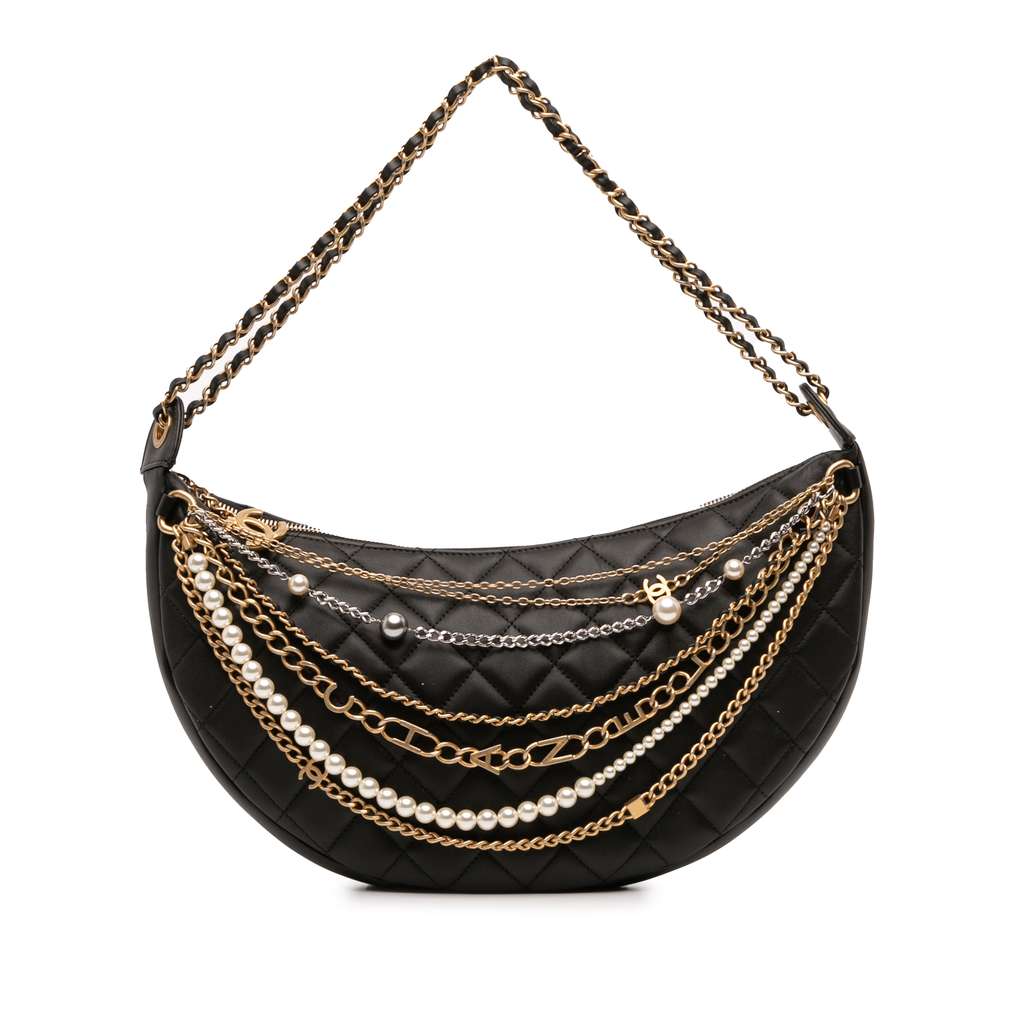 This hobo bag features a quilted lambskin leather body with chain details, a leather-woven chain strap, a top zip closure, and an interior zip pocket.