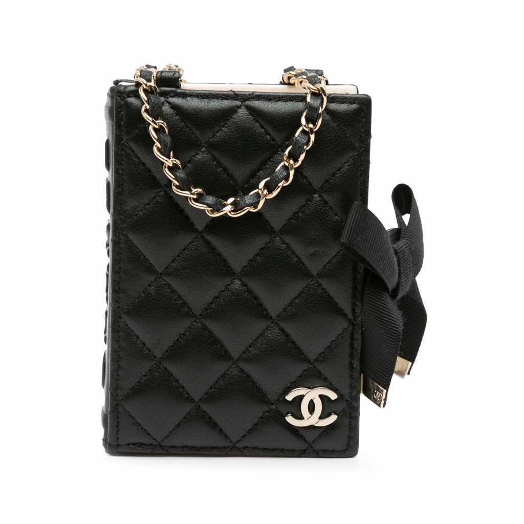 This card holder on chain features a quilted lambskin leather body, a leather-woven chain strap, a side tab with bow detail and snap button closure, and interior card slots.