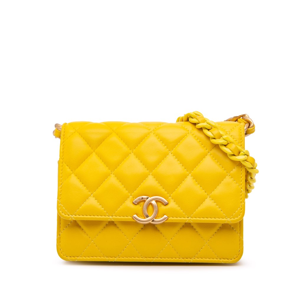 This crossbody bag features a quilted lambskin leather body, a leather woven lacquered chain strap, a flap with magnetic snap closure, an exterior back zip pocket, an interior zip compartment, and interior slip pockets and card slots.