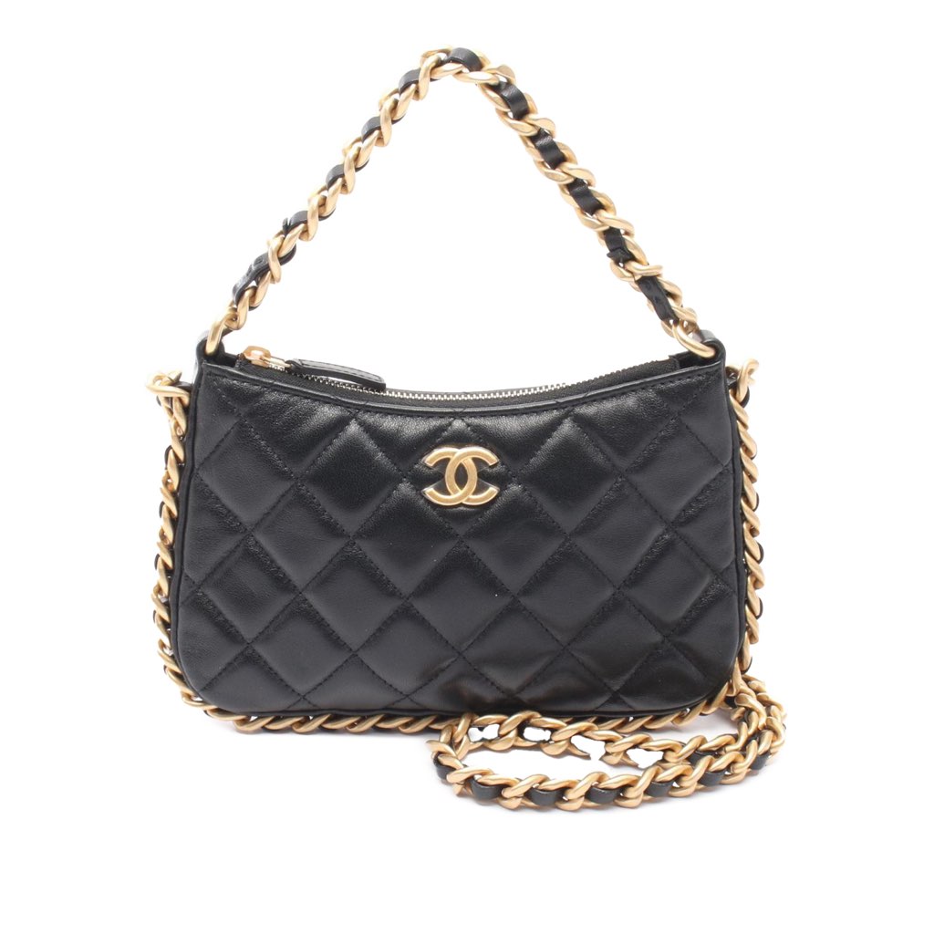 This satchel features a quilted lambskin leather body, a leather-woven chain link handle, a leather-woven chain link strap, a top zip closure, and interior zip and slip pockets.