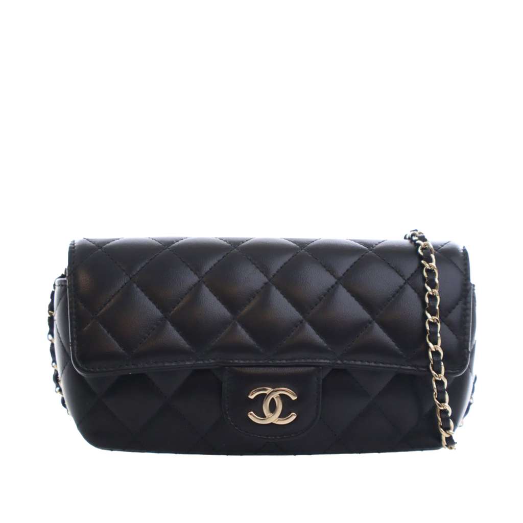 This glasses case on chain features a quilted lambskin leather body, a leather woven chain shoulder strap, a front flap with magnetic snap closure, and an exterior slip pocket.