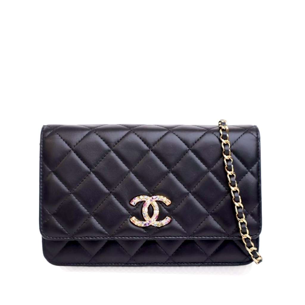 This wallet on chain features a quilted lambskin leather body, a leather woven chain link strap, a front flap with magnetic snap closure, an exterior back slip pocket, an interior zip compartment, and interior zip and slip pockets.