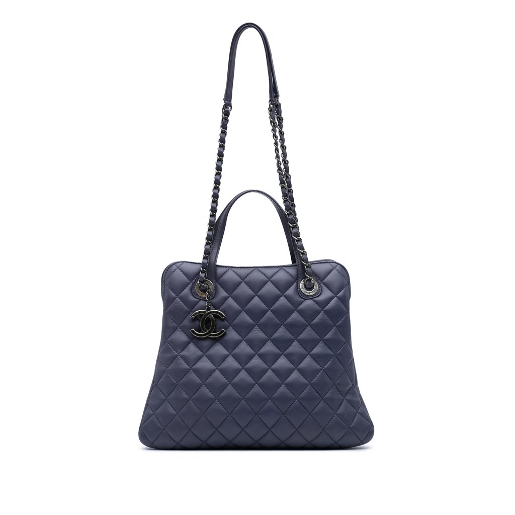 This satchel features a quilted lambskin leather body, flat leather handles, leather woven chain straps with leather guards, top magnetic snap button closures, a top zip compartment, and interior zip and slip pockets.