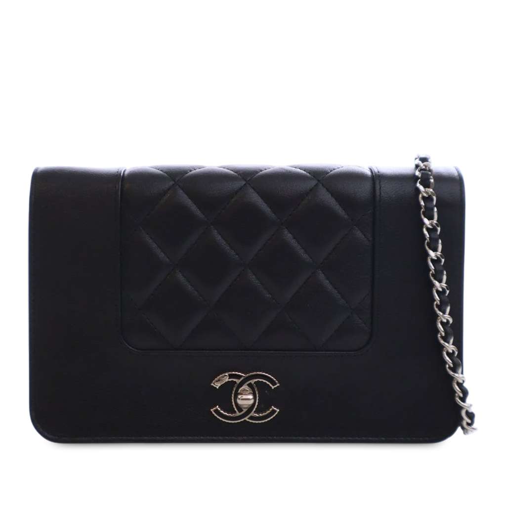 This wallet on chain features a quilted lambskin body, a leather-woven chain link strap, a front flap with CC turn lock closure, and interior zip and slip pockets.