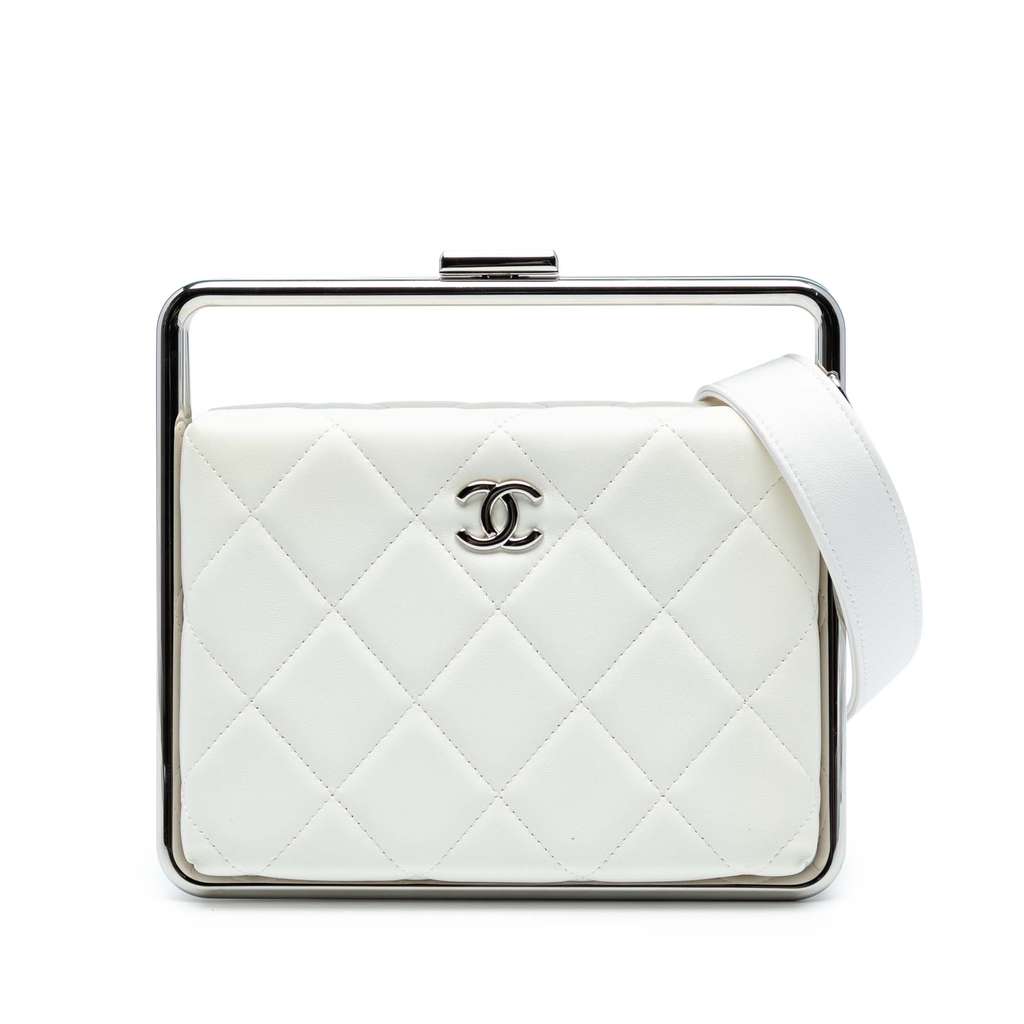 This satchel features a quilted lambskin leather body, metal bar handles with kiss lock closure, a detachable flat strap, and an interior slip pocket.