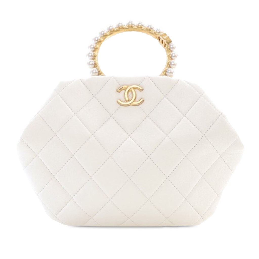 This clutch bag features a quilted lambskin leather body, a faux pearl crown top handle, an open top with magnetic button closure, and an interior slip pocket.