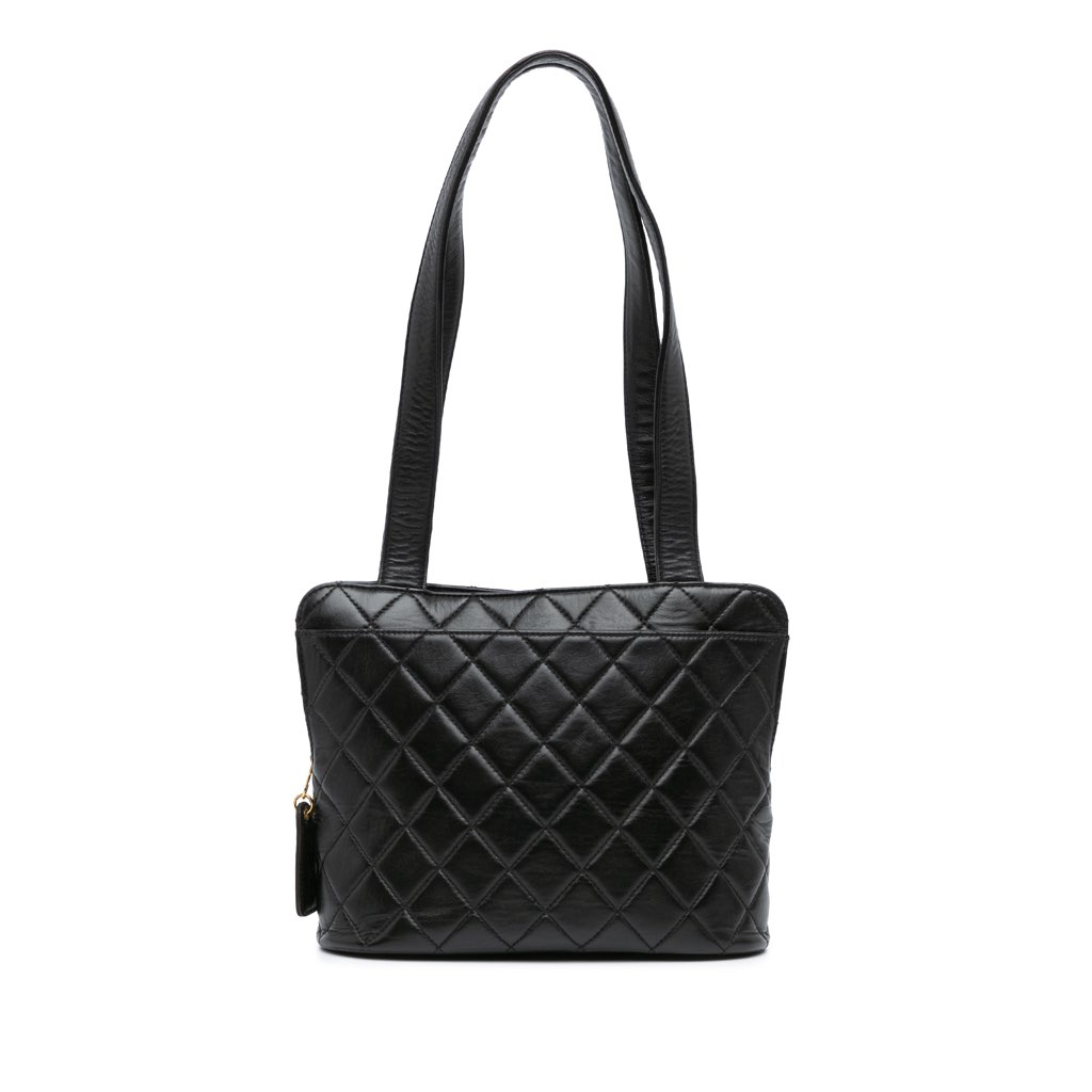 This shoulder bag features a quilted lambskin leather body, flat straps, a top zip closure, exterior slip pockets, and interior zip and slip pockets.