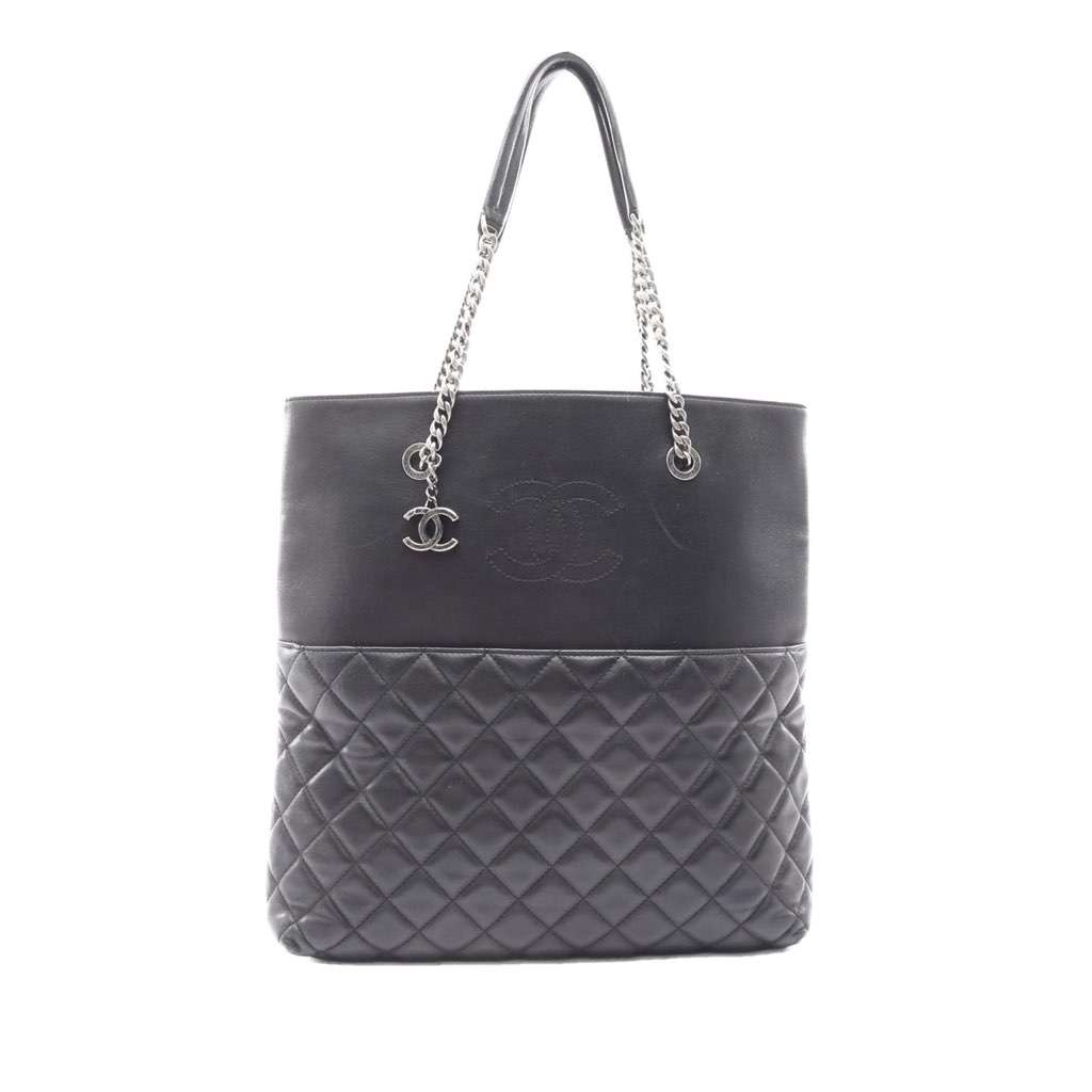 This tote bag features quilted lambskin leather body, curb chain straps with leather guard, an open top, an exterior back slip pocket, and interior zip and slip pockets.