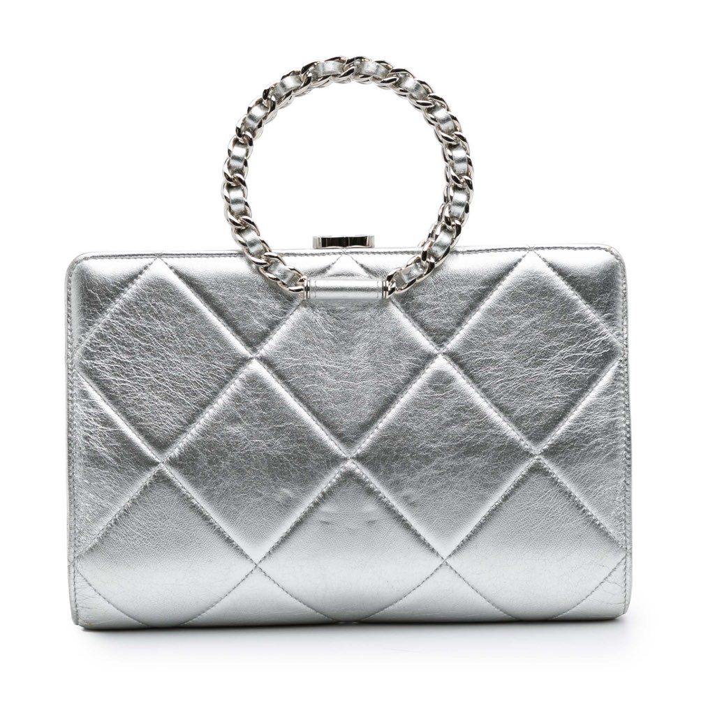 This clutch bag features a crumpled lambskin leather, a round chain handle, a top push-lock closure, and an interior zip pocket.