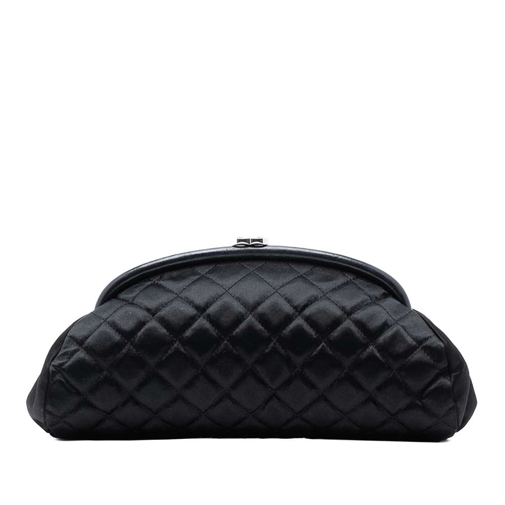 This clutch bag features a satin body, a top kiss lock closure, and interior zip and slip pockets.