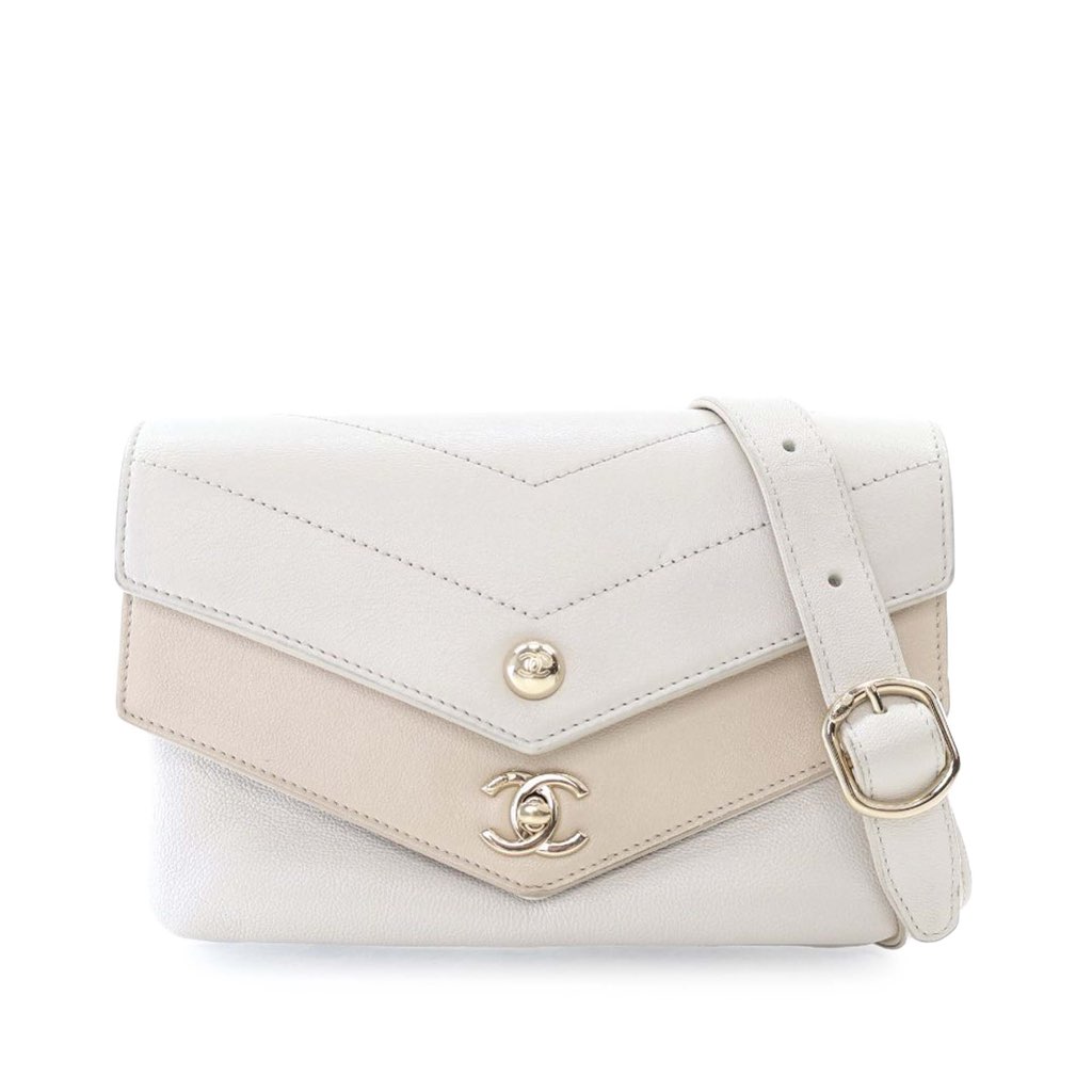 This belt bag features a quilted sheepskin body, a chain and adjustable leather waist strap, double front flaps with snap button and CC turn lock closure, and an interior zip pocket.