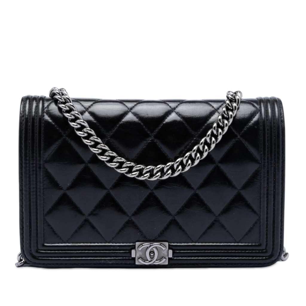 Chanel Quilted Shiny Aged Calfskin Boy Wallet On Chain Black