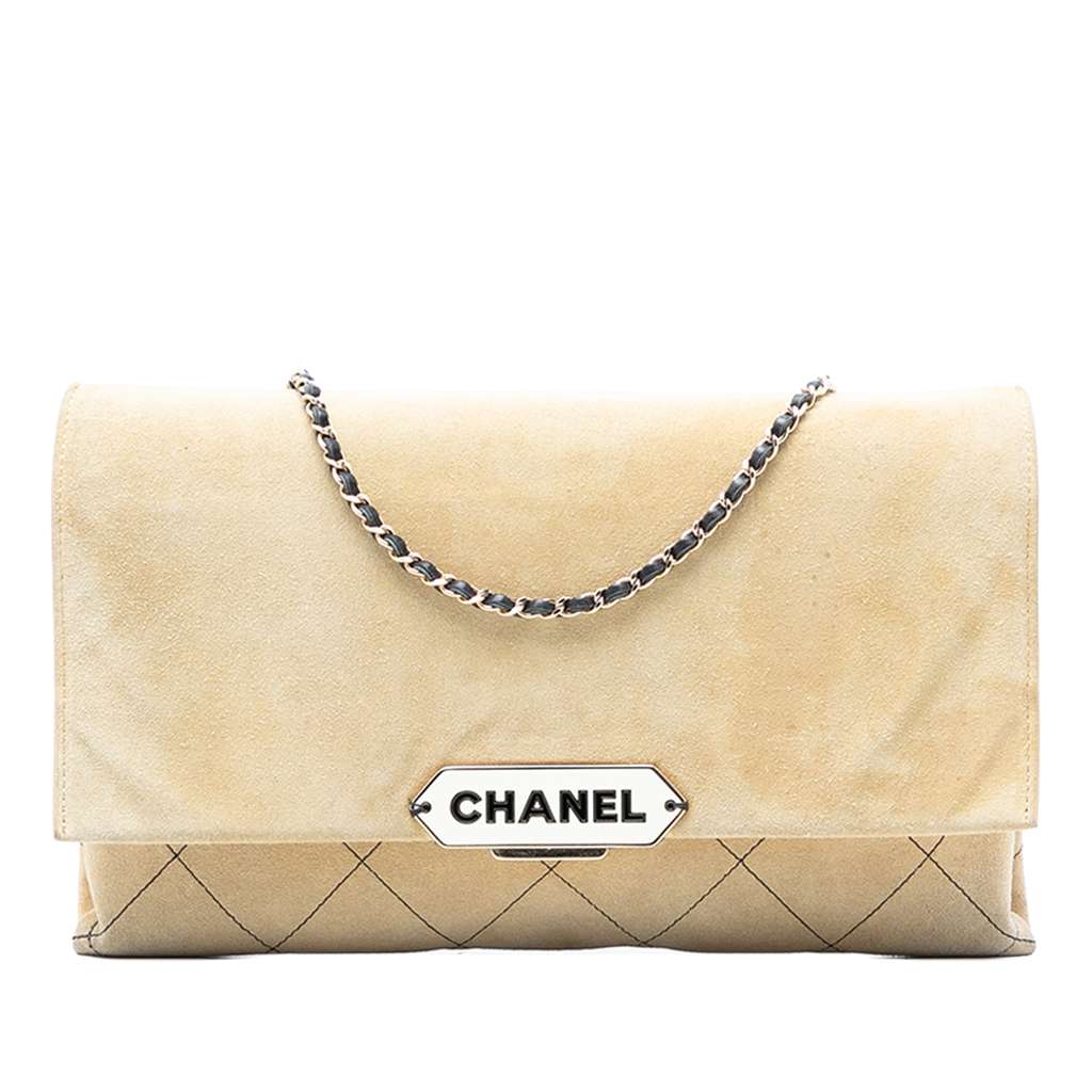 This shoulder bag features a quilted suede body, a leather-woven chain shoulder strap, a front flap with magnetic snap closure, an exterior back slip pocket, and an interior zip pocket.