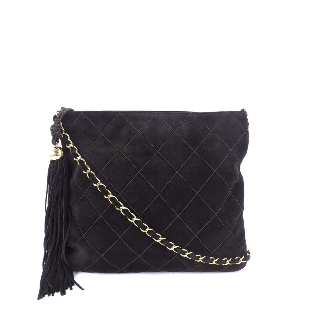 This crossbody features a quilted suede leather body, leather woven chain strap, a top zip closure with tassel detail, and interior zip and slip pockets.
