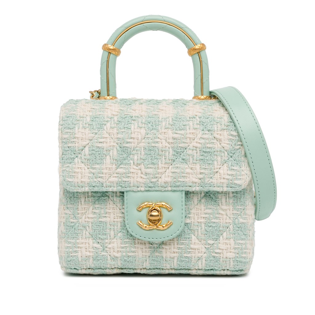 This satchel features a tweed body, a rolled leather top handle, a leather-woven chain strap with leather shoulder guard, a flap with CC turn-lock closure, an exterior back slip pocket, and interior zip and slip pockets.