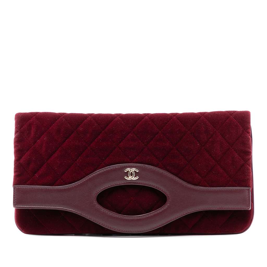 This clutch bag features a velvet body with leather trim, a front flap with magnetic snap closure, an exterior back slip pocket, and interior zip and slip pockets.