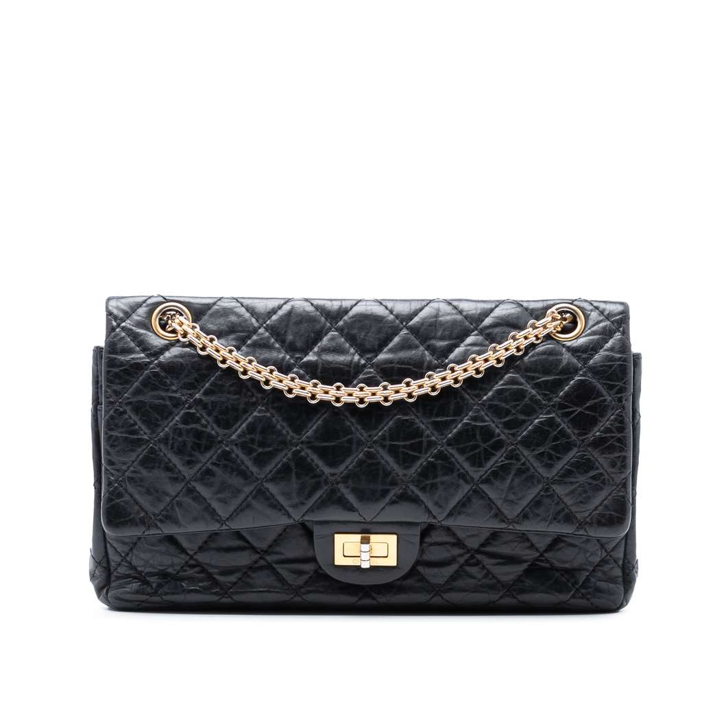 This shoulder bag features an aged calfskin body, chain link shoulder straps, double front flaps with twist lock closure, an exterior back slip pocket, and interior zip and slip pockets.