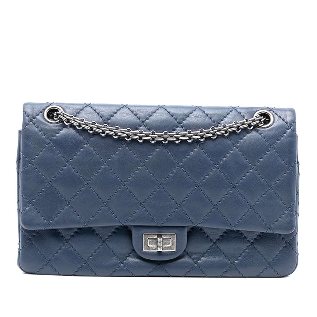 This shoulder bag features a quilted aged calfskin body, chain link shoulder straps, double front flaps with twist lock closure, an exterior back slip pocket, and interior zip and slip pockets.