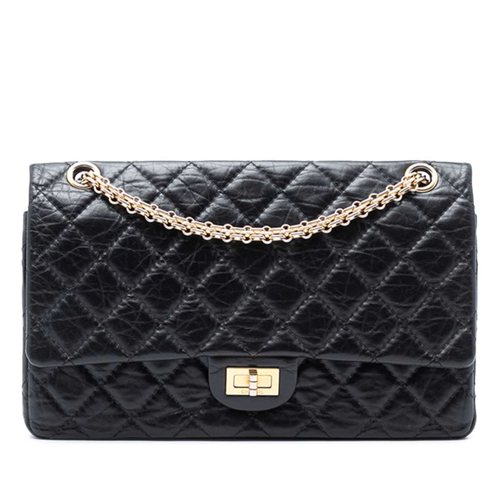 This shoulder bag features an aged calfskin body, gold -tone chain link shoulder straps, double front flaps with twist lock closure, an exterior back slip pocket, and interior zip and slip pockets.
