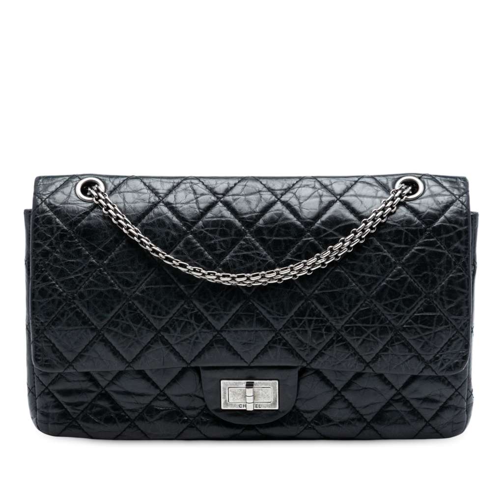 This shoulder bag features an aged calfskin leather body, silver-tone chain shoulder straps, double front flaps with twist lock closure, an exterior back slip pocket, and interior zip and slip pockets.
