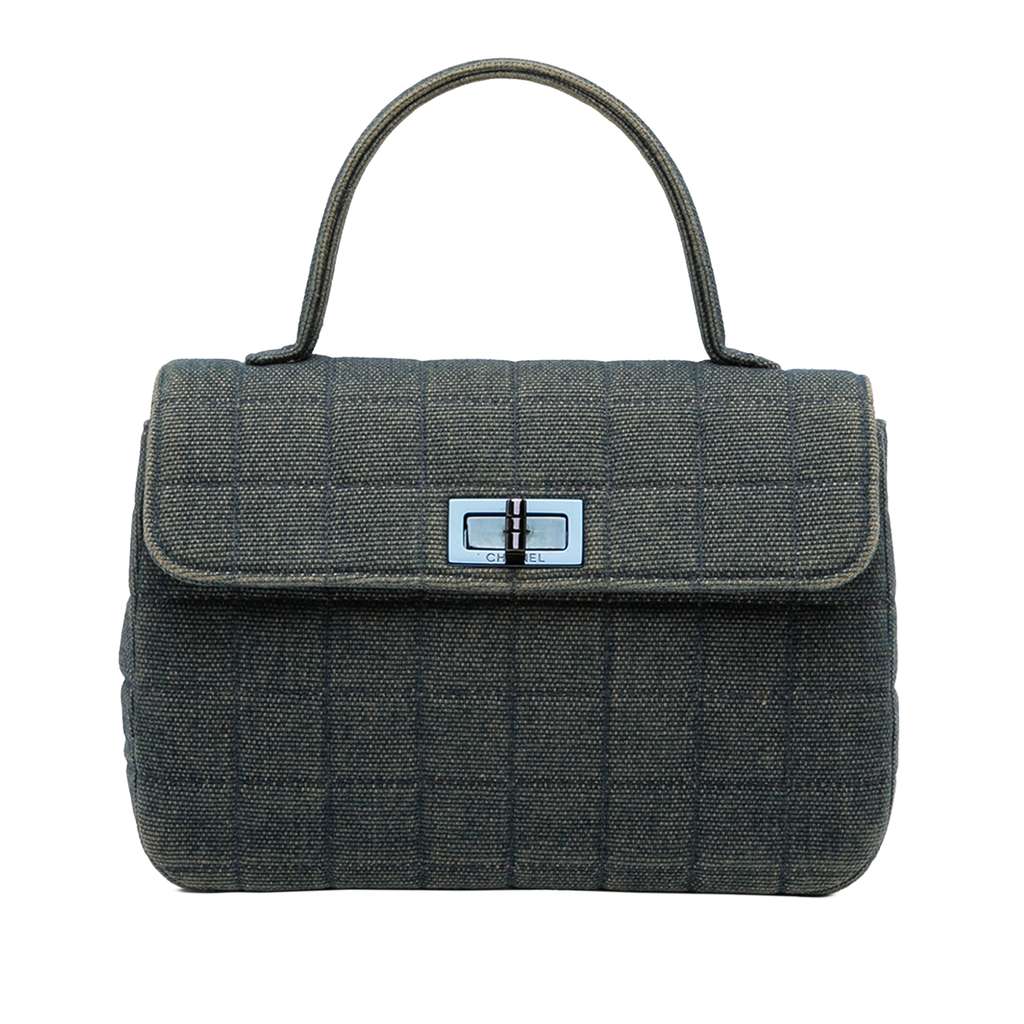This handbag features a square quilted denim body, a flat denim top handle, a front flap with a twist lock closure, and interior zip and slip pockets.
