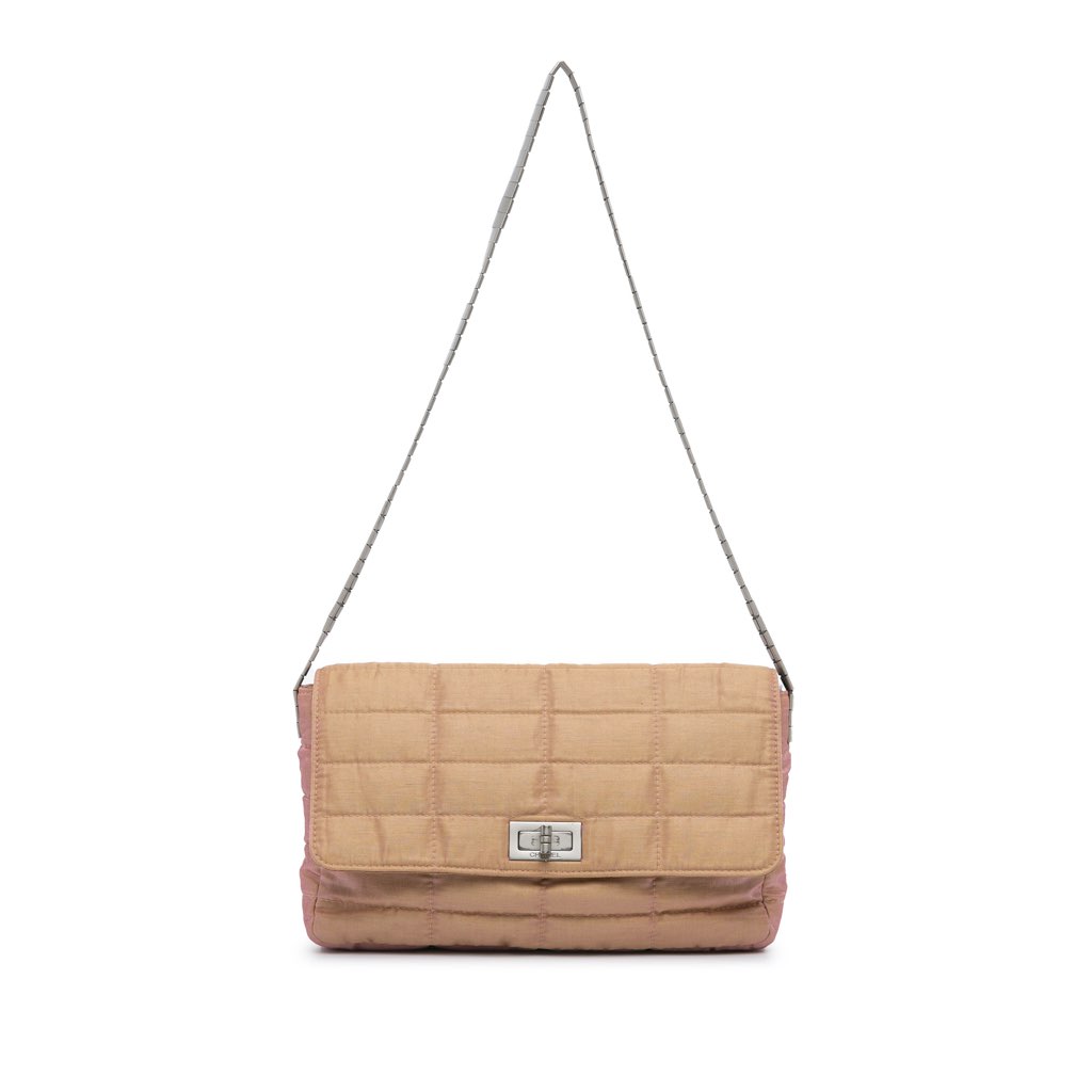 This shoulder bag features an iridescent fabric body, chain-link shoulder straps, a front flap with twist lock closure, and an interior slip pocket.