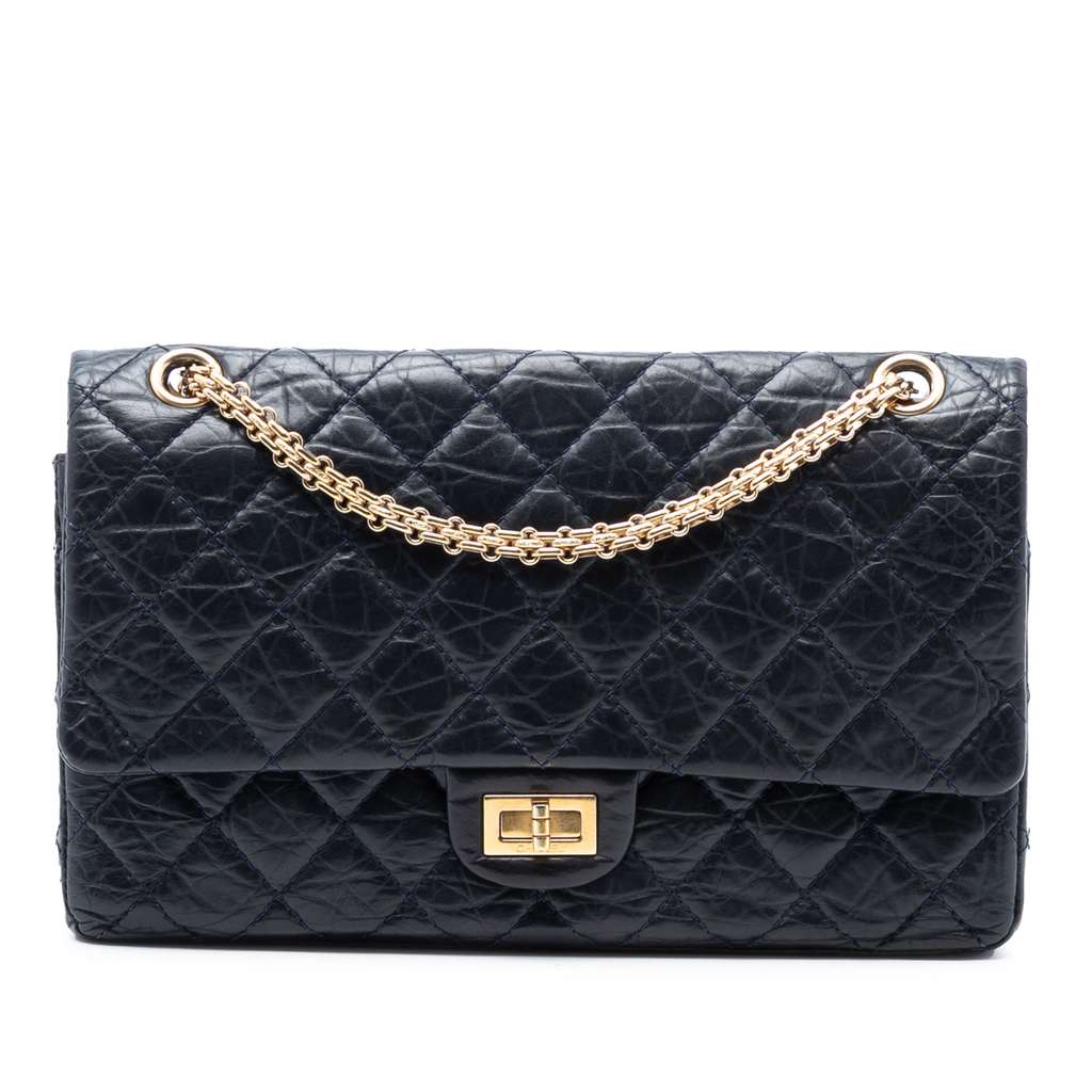 This shoulder bag features a quilted aged calfskin body, chain link shoulder straps, double front flaps with twist lock closure, an exterior back slip pocket, and interior zip and slip pockets.