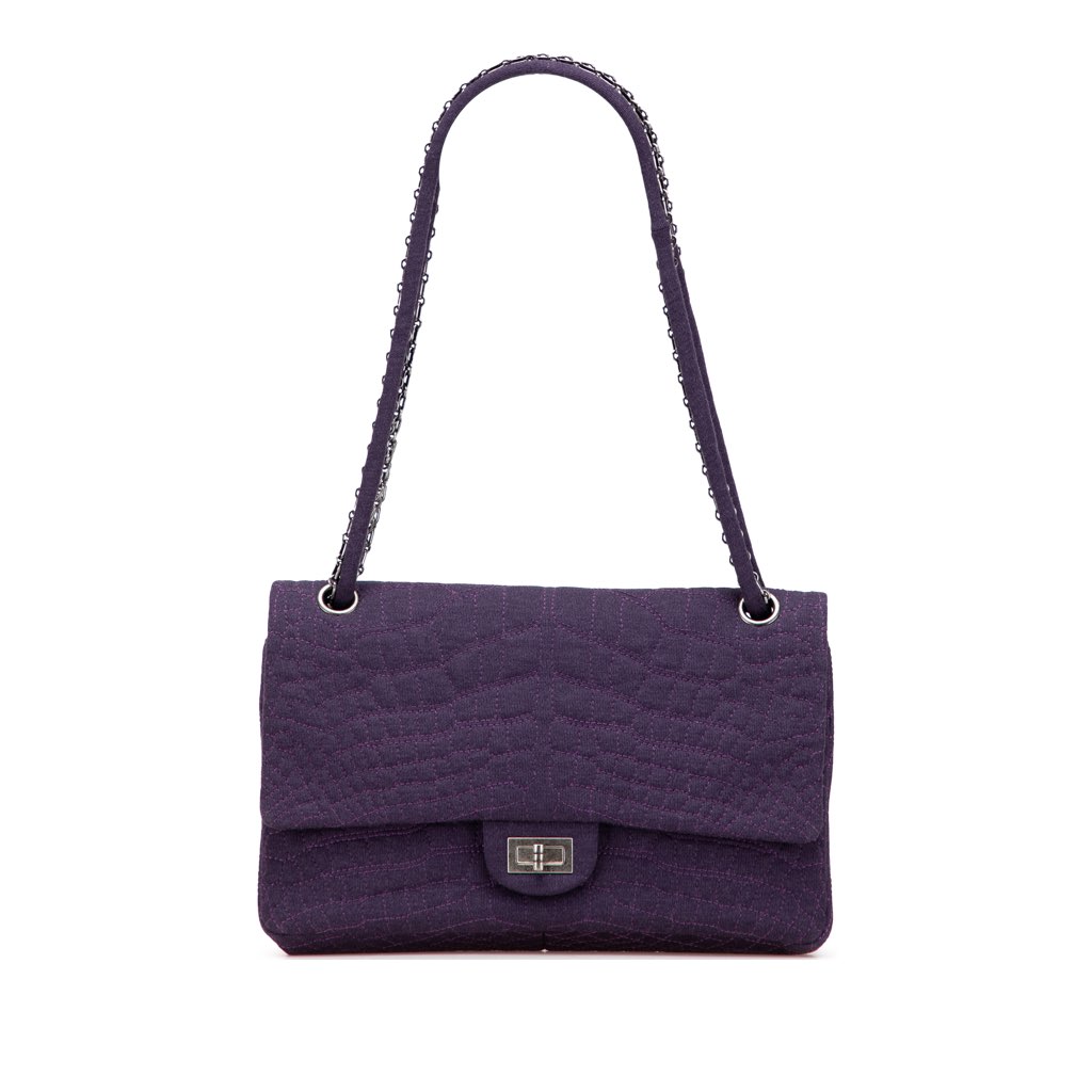This flap bag features a quilted jersey body, chain link and jersey straps, double front flaps with twist lock closure, an exterior back slip pocket, and interior slip pockets.