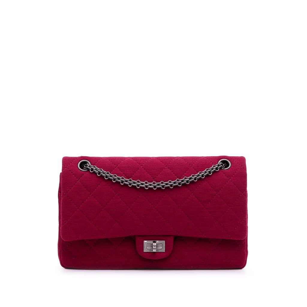 This shoulder bag features a quilted jersey body, chain link shoulder straps, double front flaps with twist-lock closure, an exterior back slip pocket, and interior zip and slip pockets.