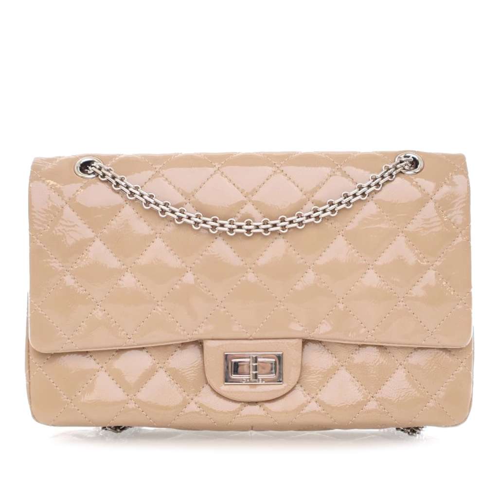 This shoulder bag features a quilted patent leather body, silver-tone chains, front flaps with a front twist lock closure, and interior zip and slip pockets.