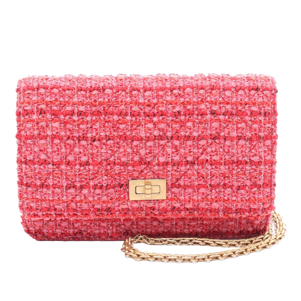 This wallet on chain features a quilted tweed body, a chain link strap, a front flap with a twist lock closure, an exterior back slip pocket, an interior zip compartment, and interior zip and slip pockets.