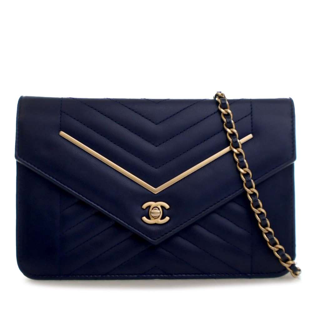 This crossbody bag features a chevron-quilted lambskin leather body, a leather woven chain strap with leather shoulder guard, a front flap with interlocking Cs and twist lock closure, and interior zip and slip pockets.