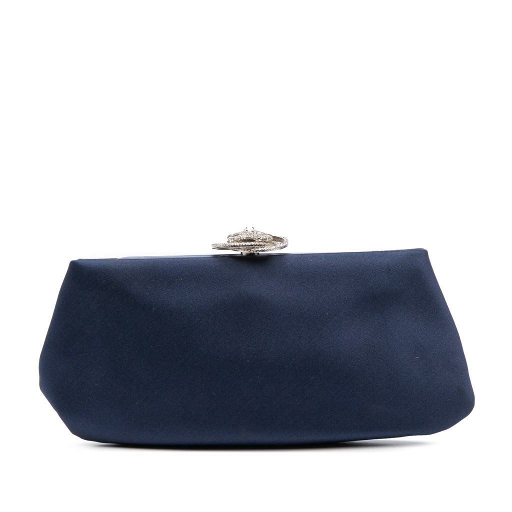 This clutch features a satin body, a top metal lock closure with rhinestone details, and an interior slip pocket.