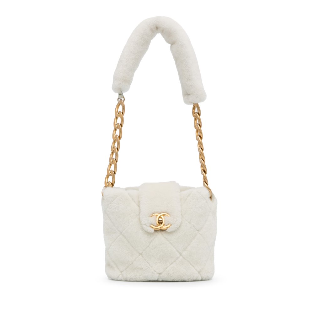 This shoulder bag features a fur body, a fur strap with gold-tone chain, a top strap with twist lock closure, and interior zip and slip pockets.