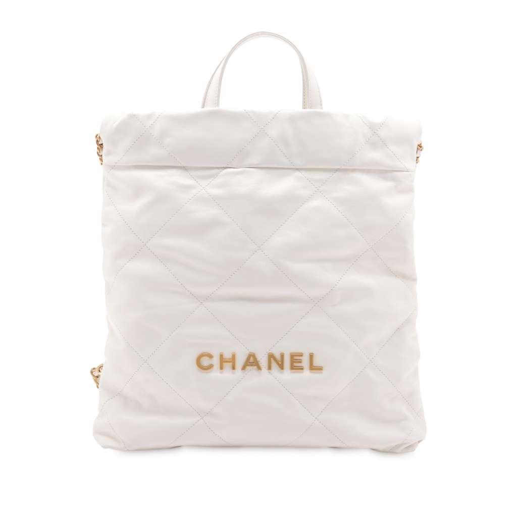 The backpack features a calfskin leather body, a flat top handles, a leather woven chain back straps, a top drawstring closure, and an interior slip pocket.