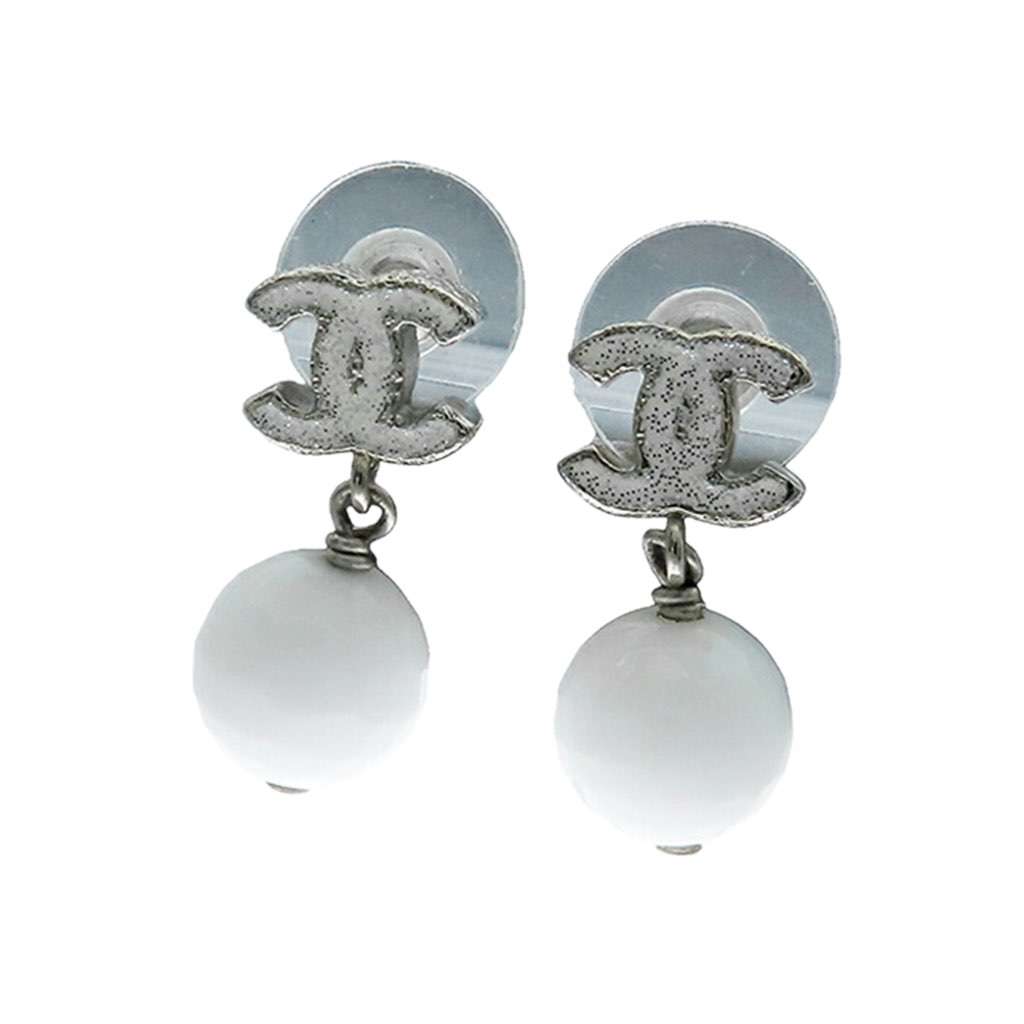 These earrings features a silver metal body, an enamel bead drop, and a push-back closure.