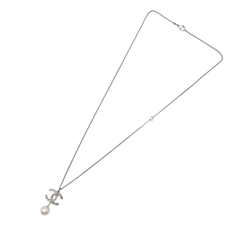 This necklace features a silver-plated body, faux pearl and rhinestone-embellished CC pendant, and a lobster claw clasp closure.