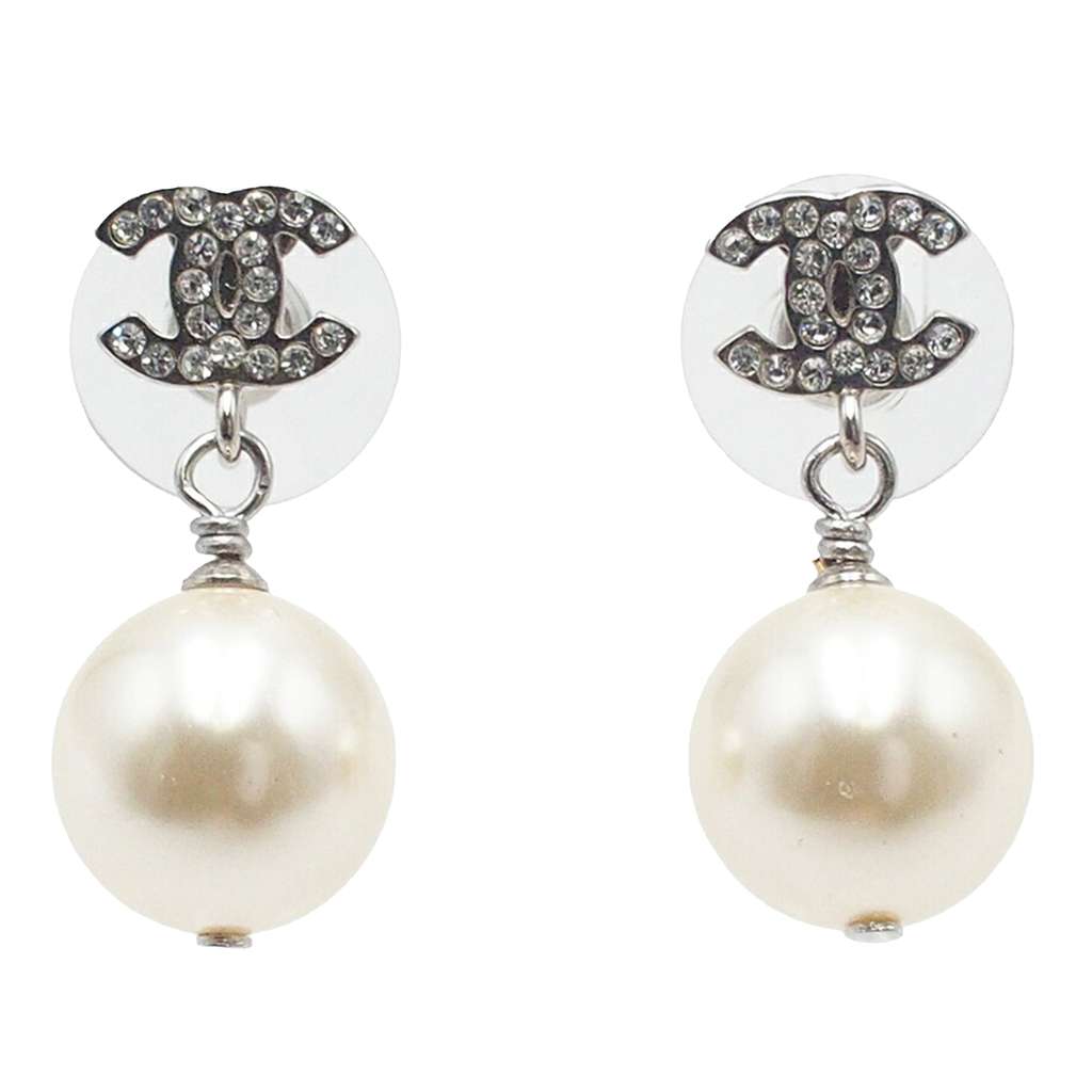 Chanel Silver Plated CC Rhinestone Faux Pearl Drop Push Back