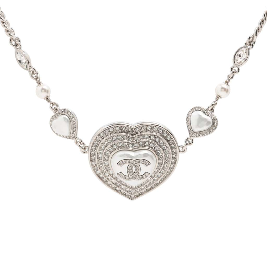 This necklace features a silver-tone chain and pendant with rhinestones and faux pearl details, and a lobster clasp closure.