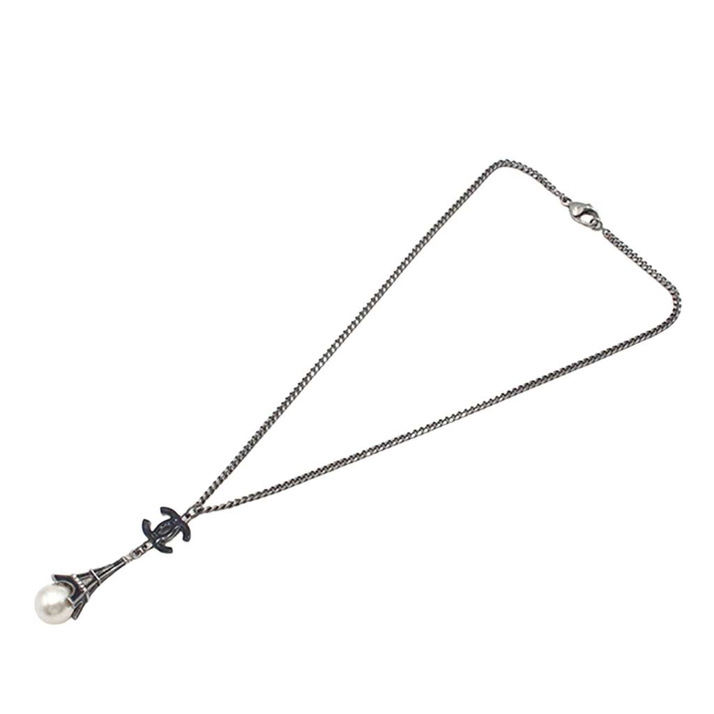 This necklace features a silver-tone chain, a faux pearl, and a lobster clasp closure.