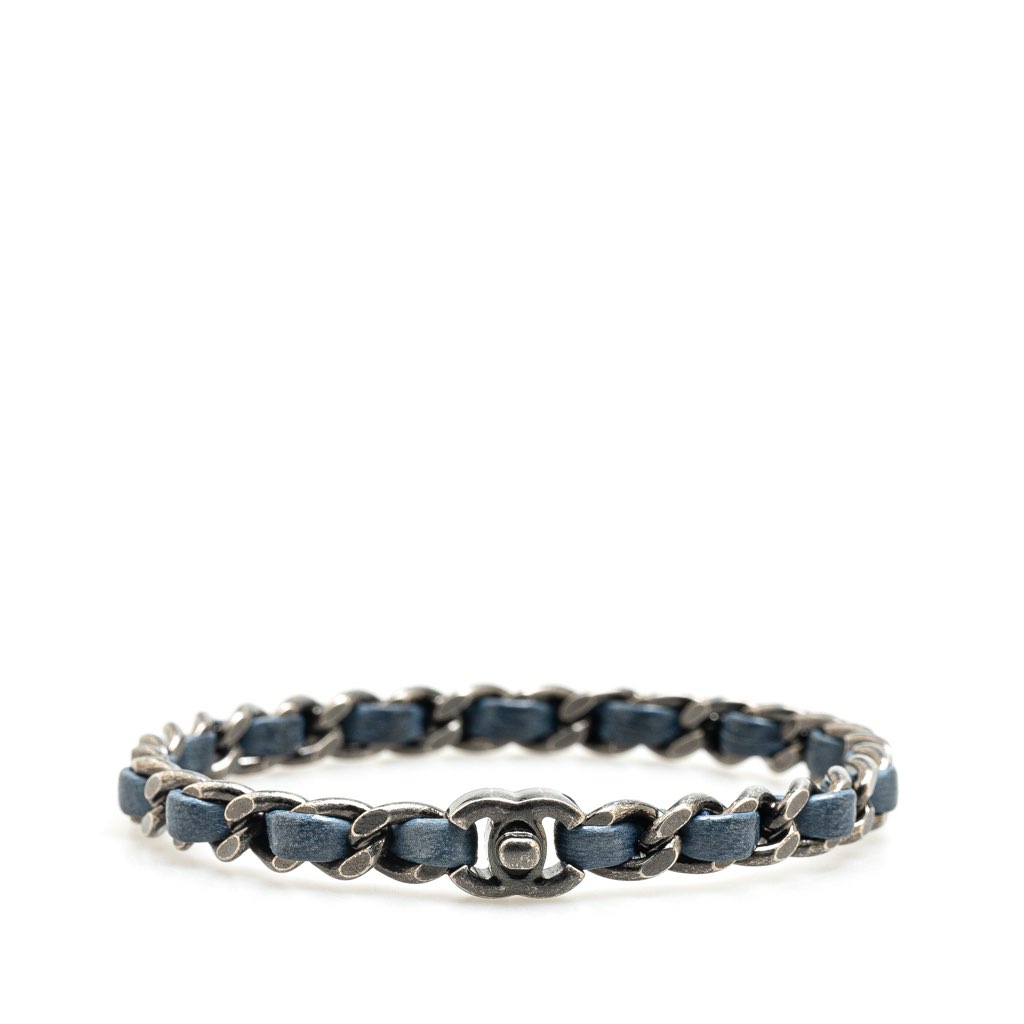 This bracelet features a leather woven chain bangle with turn lock closure.