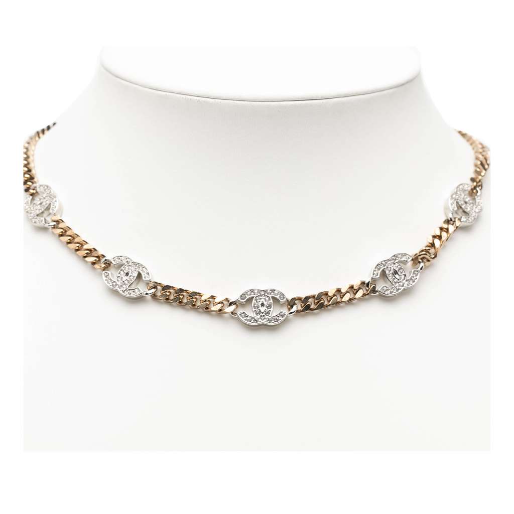 This necklace features a silver-tone metal body with rhinestone details, and lobster clasp closure.