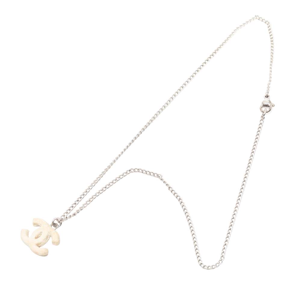 This necklace features a silver-tone metal body, a textured CC pendant, and a lobster clasp closure